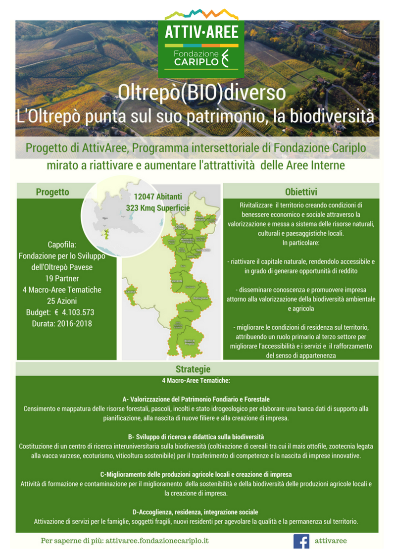 Nel progetto Oltrepò(BIO)diverso, promosso dalla Fondazione Sviluppo Oltrepò Pavese, si punta sulla biodiversità come fattore di competitività, connessione, sviluppo e ripopolamento, un progetto che si può definire di “rigenerazione rurale e comunitaria”. La biodiversità è intesa anche in senso sociale, culturale e interculturale, attribuendo un rinnovato ruolo all’agricoltura e al paesaggio anche come ambiti di applicazione di ricerca scientifica. L’accesso alla terra è un elemento fondamentale per promuovere l’attività agricola multifunzionale e per questo si intende lavorare per il superamento della frammentazione fondiaria e per la valorizzazione del patrimonio di biodiversità (ad esempio, la ricchezza di specie di farfalle presenti in Oltrepò è pari a quella dell’intera Gran Bretagna). Collegata a questa visione, è l’idea di aprire la comunità locale a giovani e migranti e di sviluppare nuovi servizi che favoriscano il ripopolamento rurale e la conciliazione lavoro-famiglie e quindi una maggiore occupazione femminile, nonché la riattivazione di luoghi che rafforzi il processo di identità culturale collettiva.