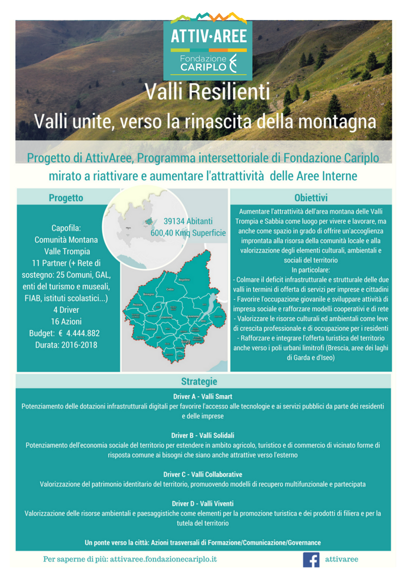 Nel progetto “Valli Resilienti”, proposto dalle Comunità Montane di Valle Trompia e Valle Sabbia, l’idea di rilancio è basata su una strategia articolata su diversi ambiti tematici, che punta a valorizzare le esperienze e competenze del territorio, insieme alle opportunità offerte dalle nuove tecnologie. Vi è inoltre un buon equilibrio tra il “dentro” e il “fuori”: da un lato servizi di prossimità agli abitanti gestiti in rete attraverso cooperative sociali e azioni di valorizzazione di prodotti locali, dall’altro efficienza amministrativa per attrarre nuovi investitori o accoglienza specializzata per target sociali fragili provenienti anche da altri territori. La leva che si intende utilizzare si basa sulla volontà di collaborazione e reciproca contaminazione tra i partner, scambiandosi buone pratiche e replicando quelle che funzionano.